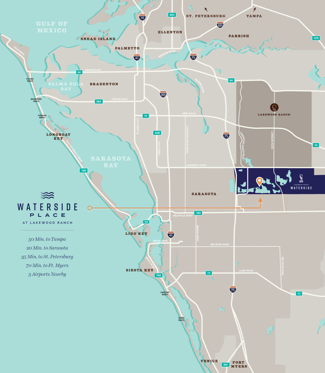 Located in Waterside, Lakewood Ranch’s first village in Sarasota County, Waterside Place is positioned to meet the demand for entertainment, office space and experiential retail needed in the area. With 862 luxury apartments and townhomes in the town center, connections to over 4,000 homes via water taxi and trails, and easy access by car to over 50,000 Lakewood Ranch residents and counting, Waterside Place will be Sarasota’s next great destination.